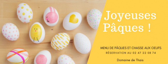 A l’occasion des fêtes de Pâques, nous vous proposons des menus gourmets à partager en famille. Petits et grands passeront un agréable moment, et le déjeuner pourra être suivi d’une chasse aux œufs organisée au Domaine de Thais. Réservations au 02 47 22 08 74